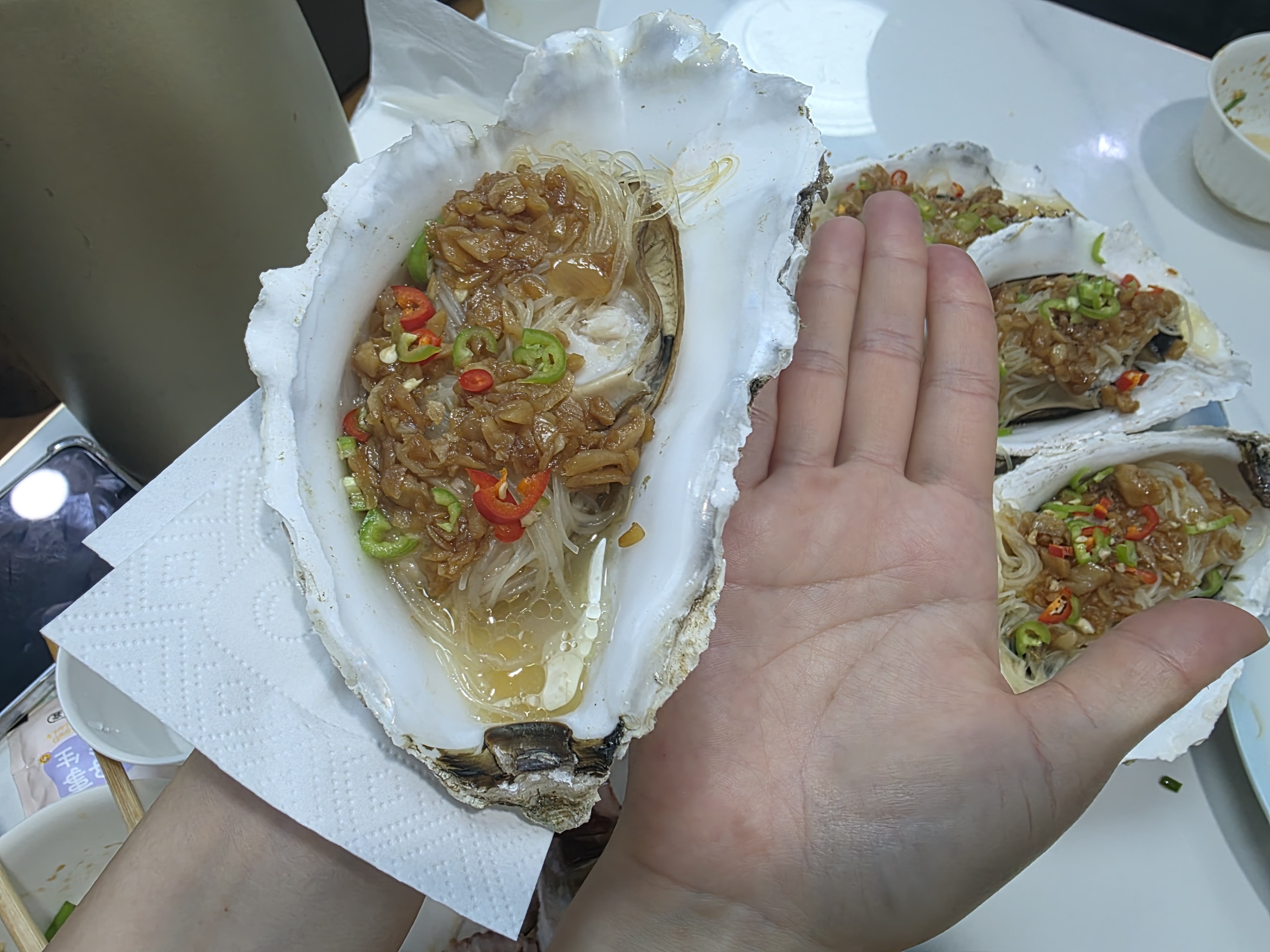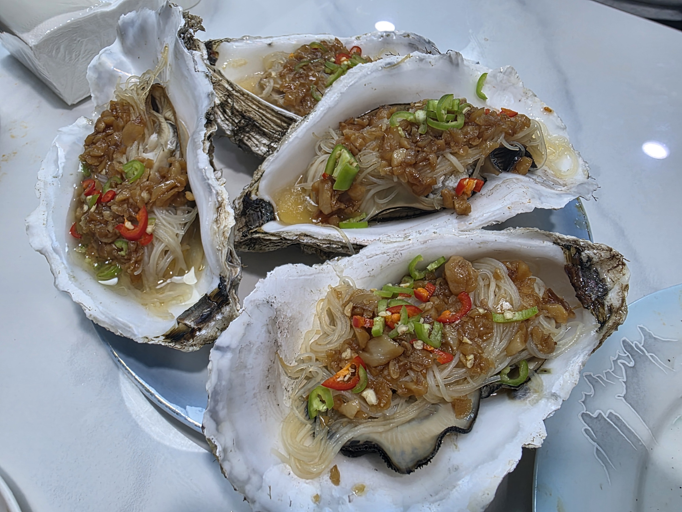 한 손에 가득 찰 정도로 큰 생굴에 마늘과 당면을 듬뿍 얹어 쪄낸 메뉴.
