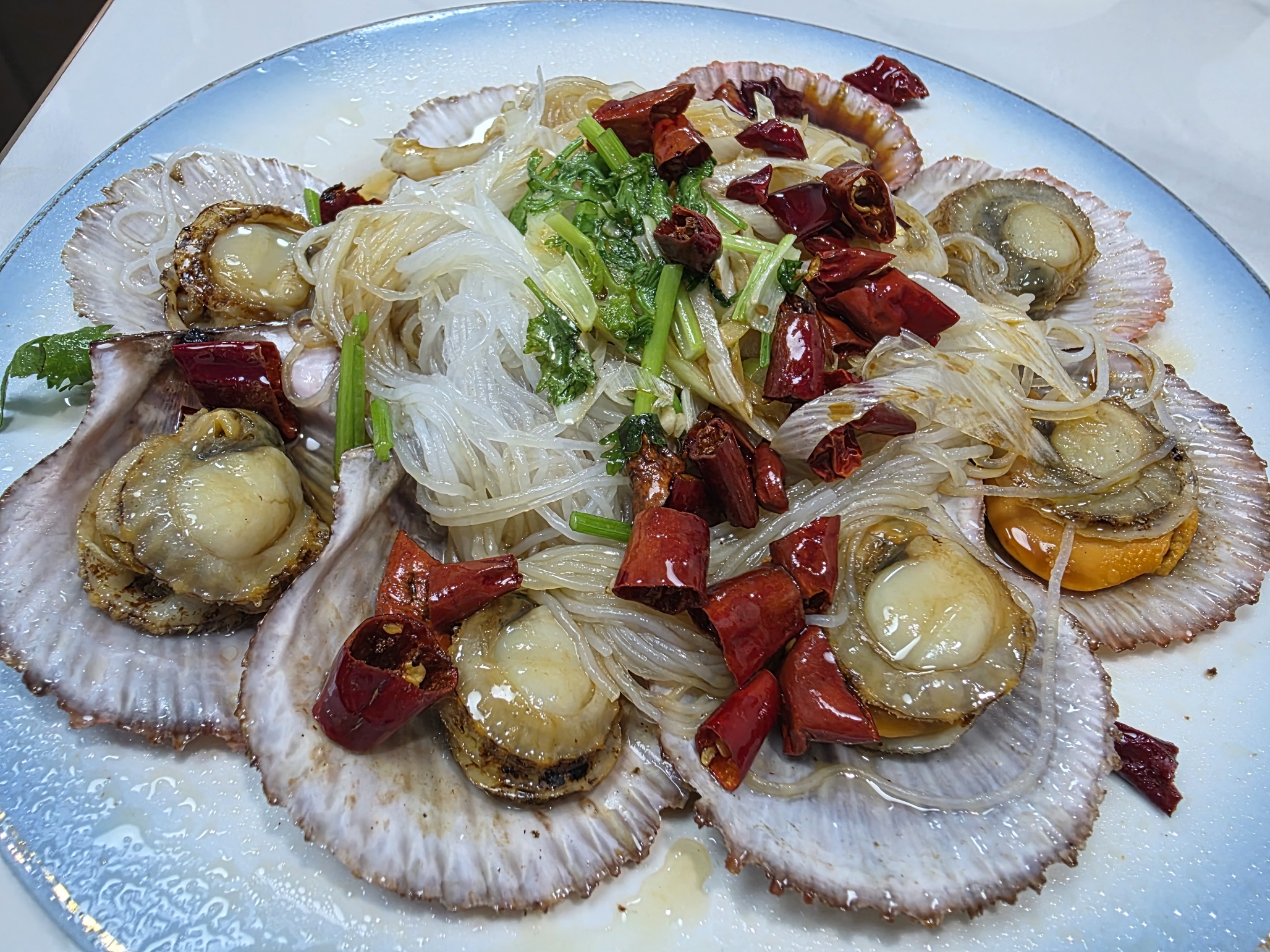 홍고추와 마늘을 곁들인 당면을 얹어 쪄낸 가리비 요리.