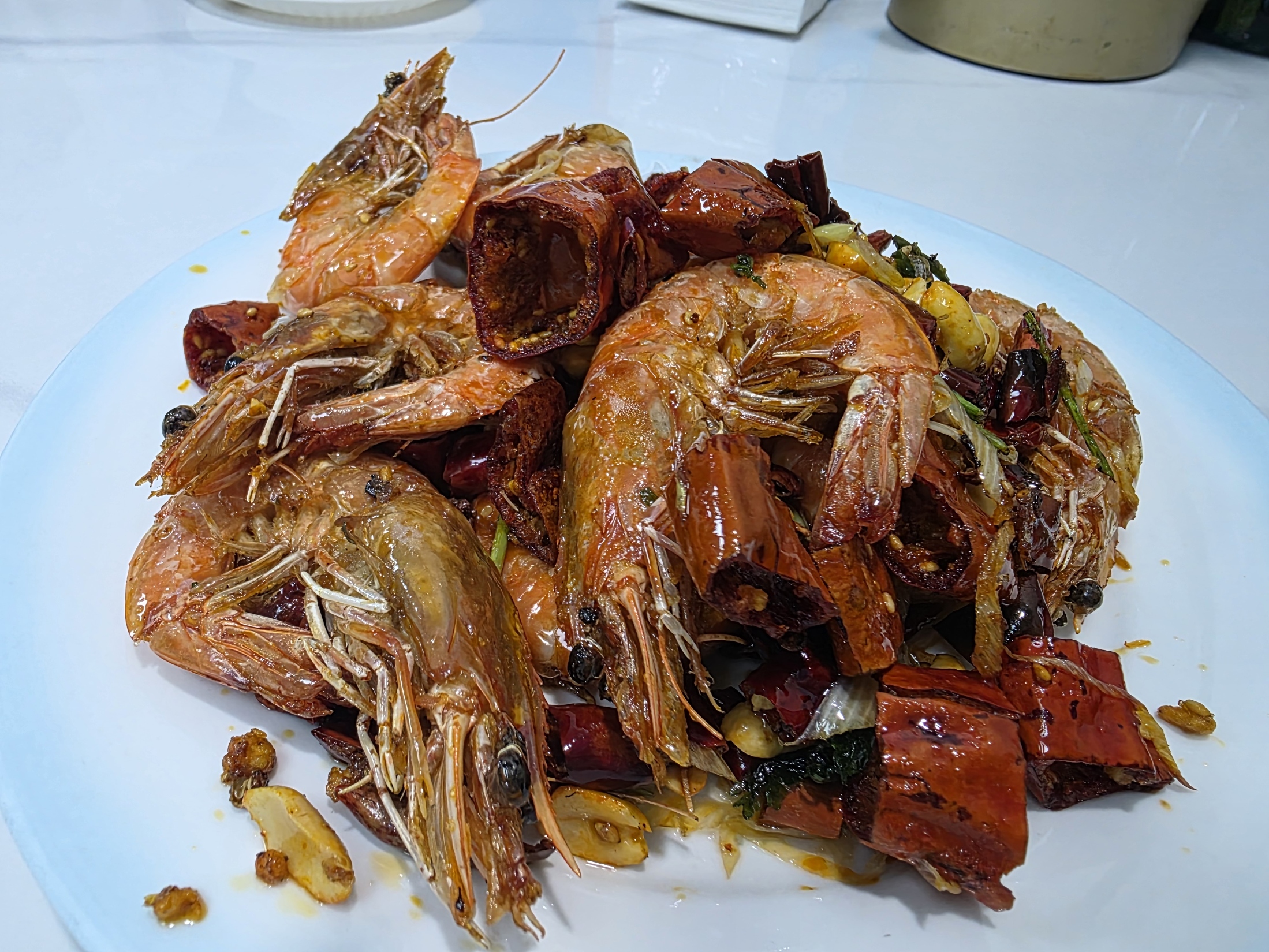 통통한 새우를 마늘, 고추, 향신료와 함께 마라 스타일로 볶아낸 요리.