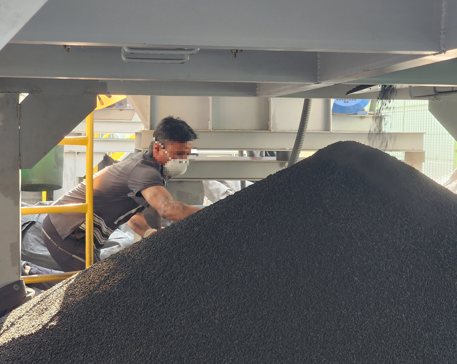 활성탄을 단순반복 작업을 통해 톤백에 담아냅니다.
