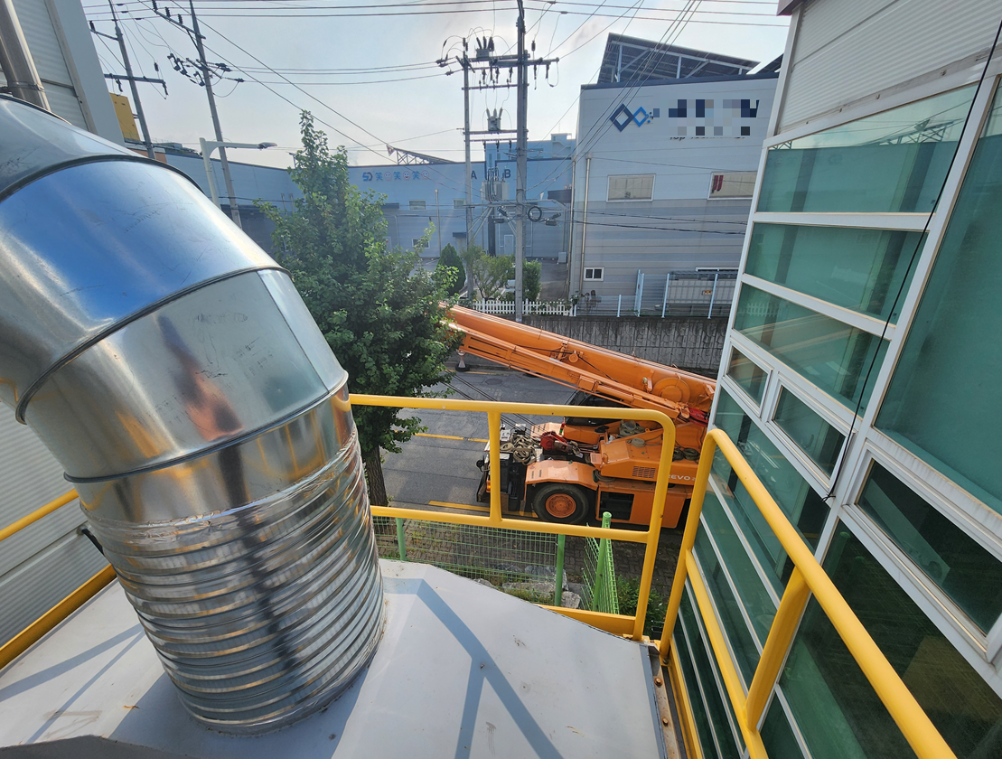 또한 해당 현장은 지게차가 드나들 수 없는 조건이라 크레인 사용이 필수였는데, 고압선이 집진기와 같은 라인에 위치해 있어서 상당히 까다로운 작업조건을 가지고 있었습니다.