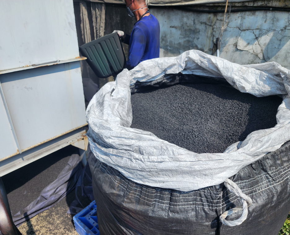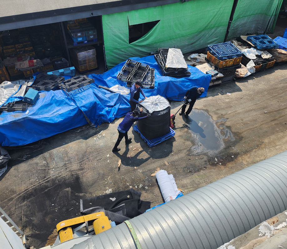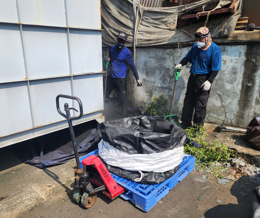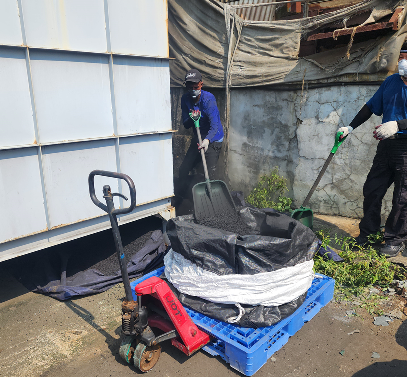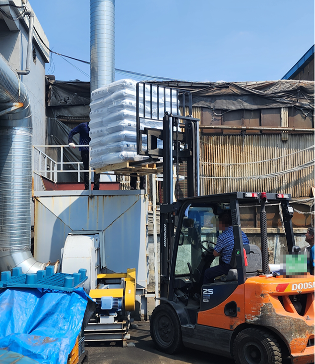 활성탄을 톤백에 담아내고 차량에 실을 수 있도록 바깥으로 빼줍니다.